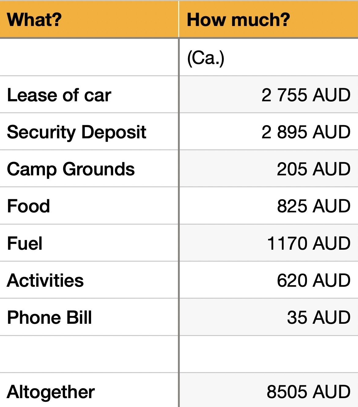 I budgeted around 8500 AUD for the whole trip, covering everything from the vehicle lease and deposit to food and fuel etc. You can check out the detailed budget in the table below. Just a heads up, this budget is for one person, so be sure to add up the extra expenses for any additional travel companions. I actually ended up spending less than I anticipated, but it’s always smart to have a safety margin. Keep in mind, I rarely went out for dinner and almost skipped the drinks altogether. If you plan to enjoy more dining out or nightlife, definitely budget for a bit more. I mostly stayed at free campgrounds but treated myself to a cheaper hotel every now and then!